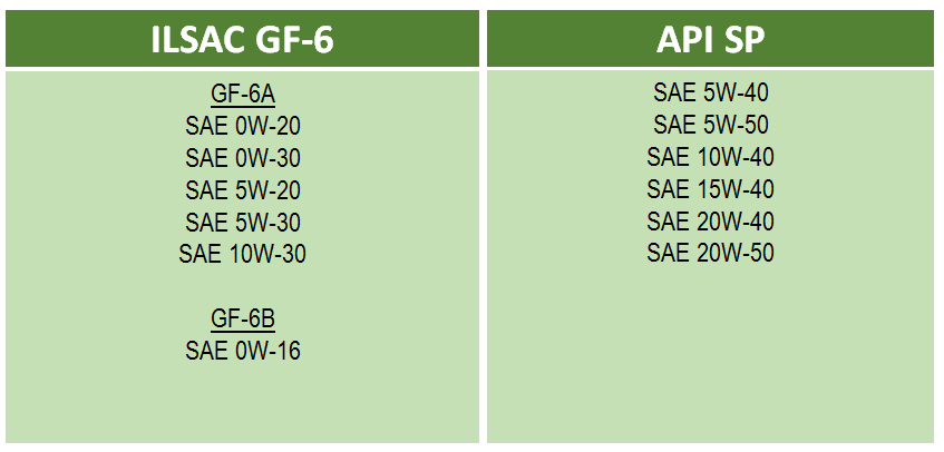 – API SP toma como base la especificación ILSAC GF-6, con la excepción del ahorro de gasolina.