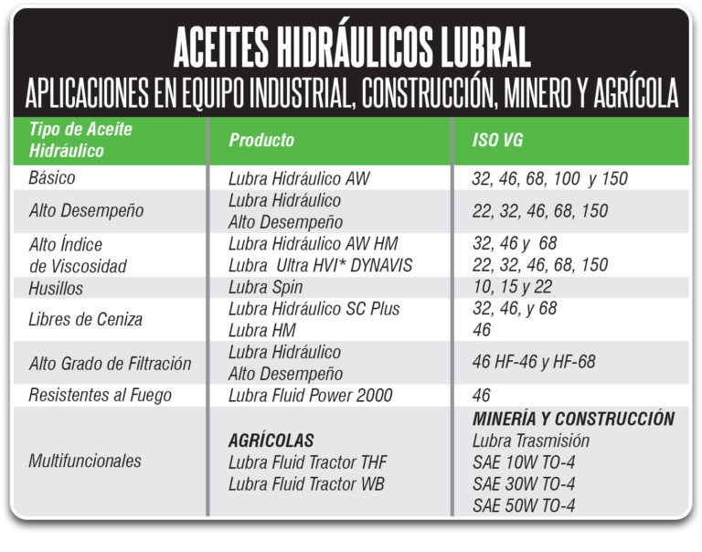 Los aceites hidráulicos son fluidos transmisores de potencia que se utilizan para transformar, controlar, y transmitir los esfuerzos mecánicos a través de una variación de presión o de flujo. Dependiendo de su aplicación, la viscosidad o aditivación deberá ser la adecuada en cada situación.