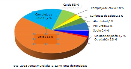 Las grasas de litio fueron desarrolladas en el período de la Segunda Guerra Mundial y, luego, tuvieron éxito por su buen rendimiento y bajo precio. Hoy, las grasas de litio y complejo de litio responden por más del 75% del consumo, como se ve en el gráfico.