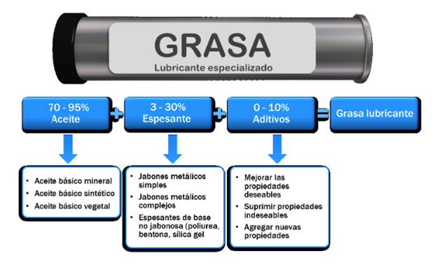 Como lo indica esta definición, hay tres componentes que forman grasas lubricantes. Estos componentes son aceite, espesante y aditivos. El aceite base y el paquete de aditivos son los componentes principales en las formulaciones de grasa y, como tales, ejercen una influencia considerable en el comportamiento de la grasa. El espesante a menudo se conoce como una esponja que contiene el lubricante (aceite base más aditivos).