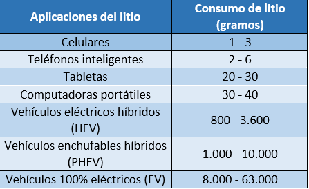 La tabla 1 compara el consumo del metal litio en equipos comunes como teléfonos inteligentes y tabletas, y el consumo en vehículos eléctricos e híbridos. Las proyecciones de la industria productora de litio indican que el consumo global debe saltar de alrededor de 20 mil toneladas/año a más de 50 mil toneladas/año hasta 2025. Este aumento de demanda ciertamente se reflejará en los costos de las grasas de litio.